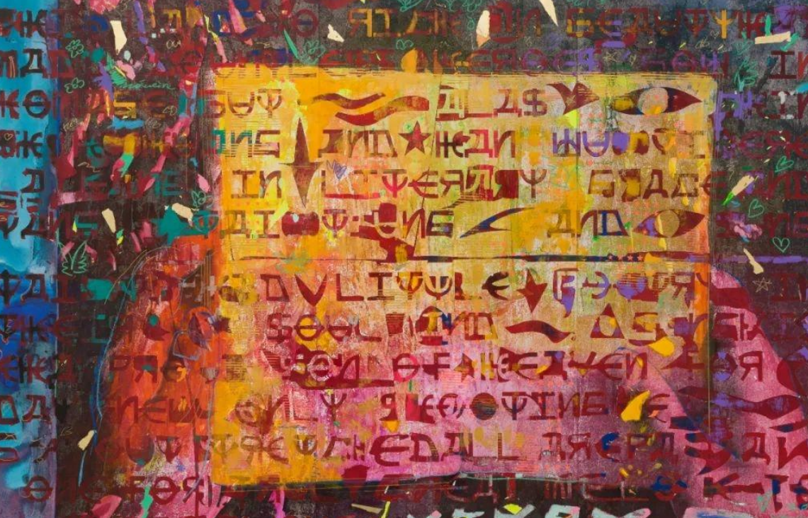 - Material: Oil and acrylic on canvas, paper collage, transparent watercolor, crayon, pastel, gold leaf, stamps, spray paint, paint pen, marker